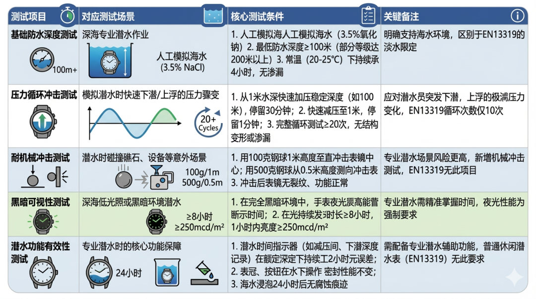 而且在 EN13319 之上,其实还有像 ISO 6425 这类更严苛的专业潜水表认证标准,它们对实际使用场景的要求会更细致,但即便是这些更高级的认证,也无法完全模拟海洋中所有的不确定性。