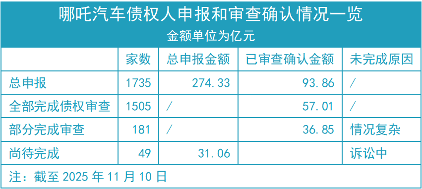 随着两次债权人会议,哪吒汽车的“窟窿”也越来越大、越来越清晰。共有1735家债权人申报了高达274.33亿元的债权,不过目前为止被审查确认的,也有93.86亿。