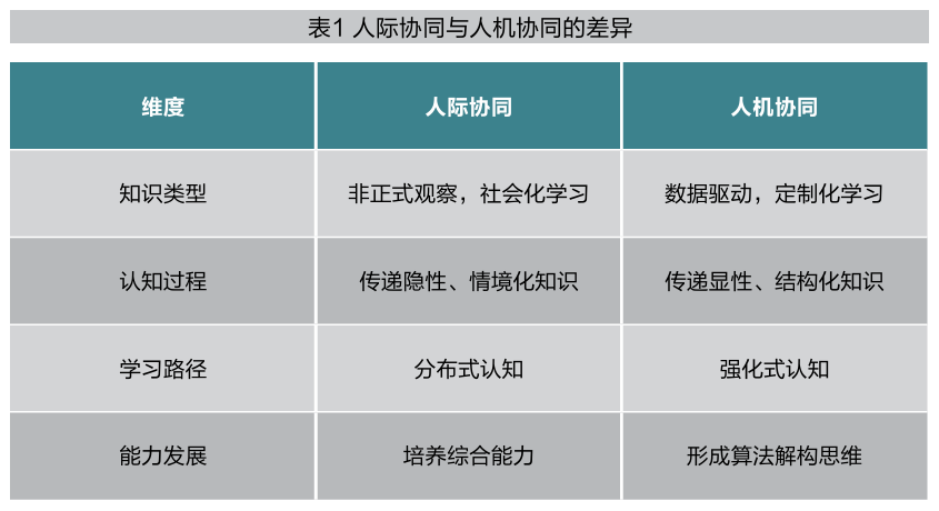 人机协同系统所具备的功能互补、动态适应、认知耦合特征,使得人机协同学习在知识类型、认知过程、学习路径、能力发展等方面均产生了与传统人际协同学习不一样的表现(见表1)。