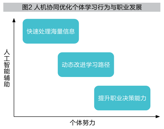 人机协同学习正在对职业发展过程产生长期影响(见图2)。首先,人机协同让职业技能学习事半功倍。AI能快速筛选海量信息,帮人们省去烦琐的查找过程;还能提供即时、精准的反馈,比如编程练习中的错误提示,帮助我们更快改进。