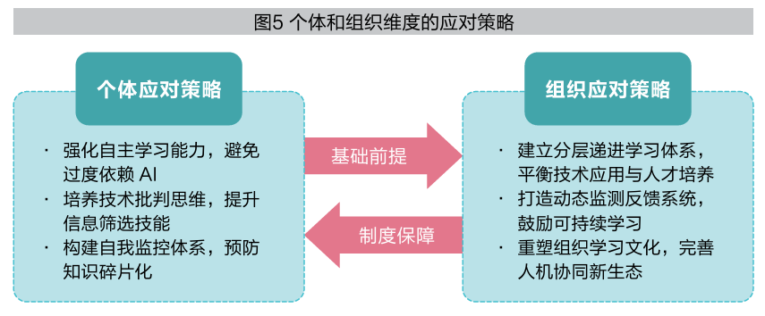 面对上述诸多困扰,个体和组织都必须冷静直面并主动应战。个体需要主动重构自身学习模式,培养算法思维与批判性思考能力,采取与AI协同进化的学习策略。组织则需构建科学的学习支持体系,设计人机互补的培训机制、建立知识共享平台、培育开放包容的学习文化等,实现技术赋能与人才成长的良性循环。这种个体与组织的协同进化,是应对自动化时代人机协同挑战的关键路径。具体而言,人机协同学习的应对策略分为两类六项(见图5),一类是个体维度,即前三项;另一类是组织维度,即后三项。