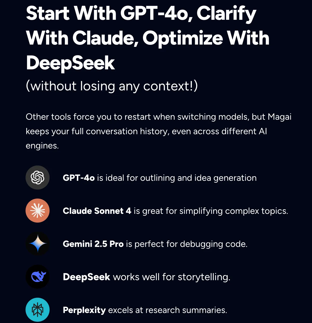 在当下的多模型竞速时代,Magai 代表的是一种越来越清晰的趋势:把 GPT、Claude、Gemini、LLaMA、DeepSeek 等模型统一收纳到一个工作台里,让用户不再需要在多个网站、多个账号之间来回切换。