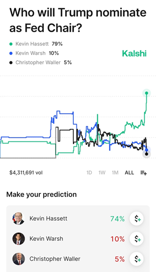 美国博彩网站Kalshi上,特朗普提名哈塞特为美联储主席的概率已飙升至80%,高于一周前的40%。上周末,美国总统特朗普在空军一号上对媒体表示,已经决定了谁将接替美联储主席杰罗姆·鲍威尔。“我知道我会选谁,是的。”