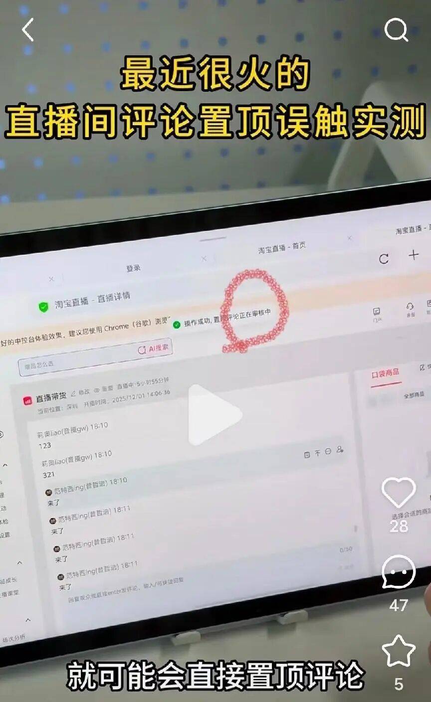 有博主发布演示视频,认为淘宝直播中控手机端交互界面存在缺陷,在滑动评论时可能被识别为点击评论置顶。但随即有网友指出,置顶评论本身需要经过审核,并有明显的弹窗提示和置顶时长限制。