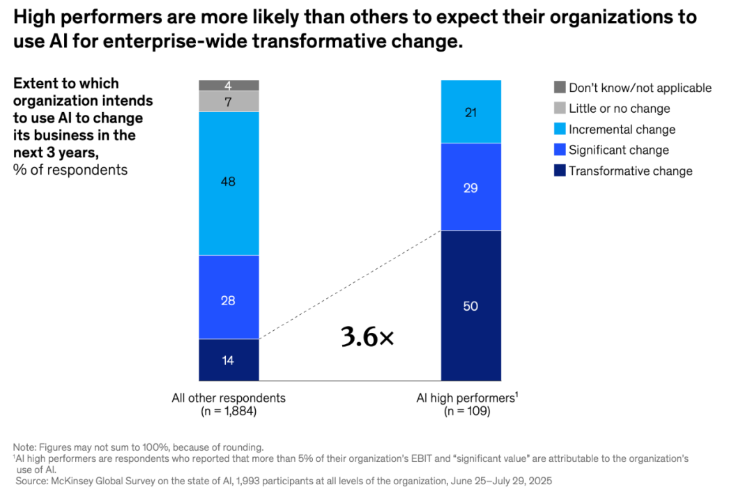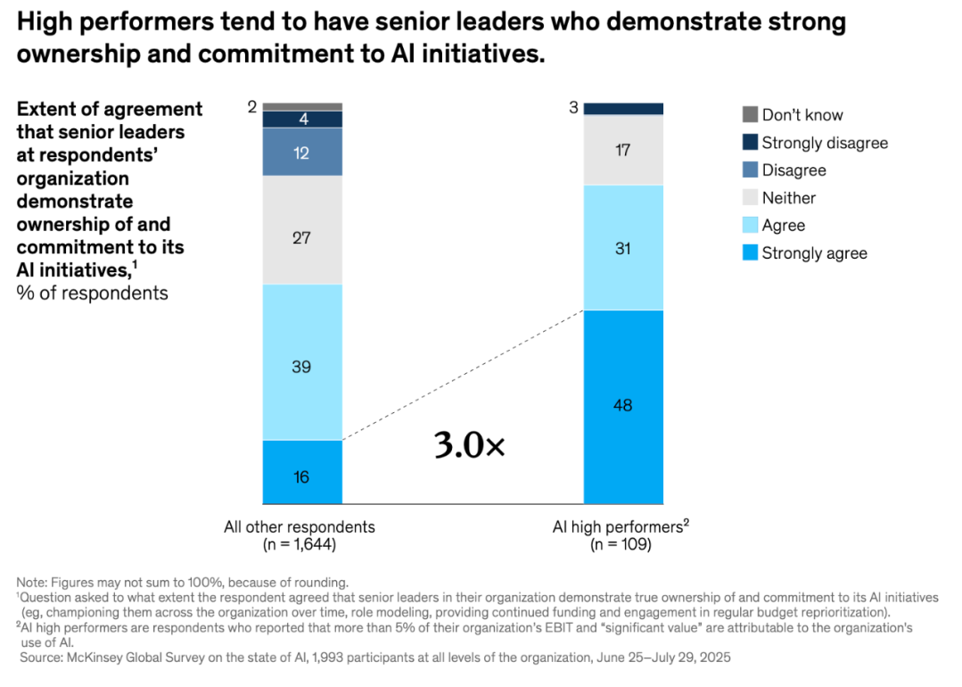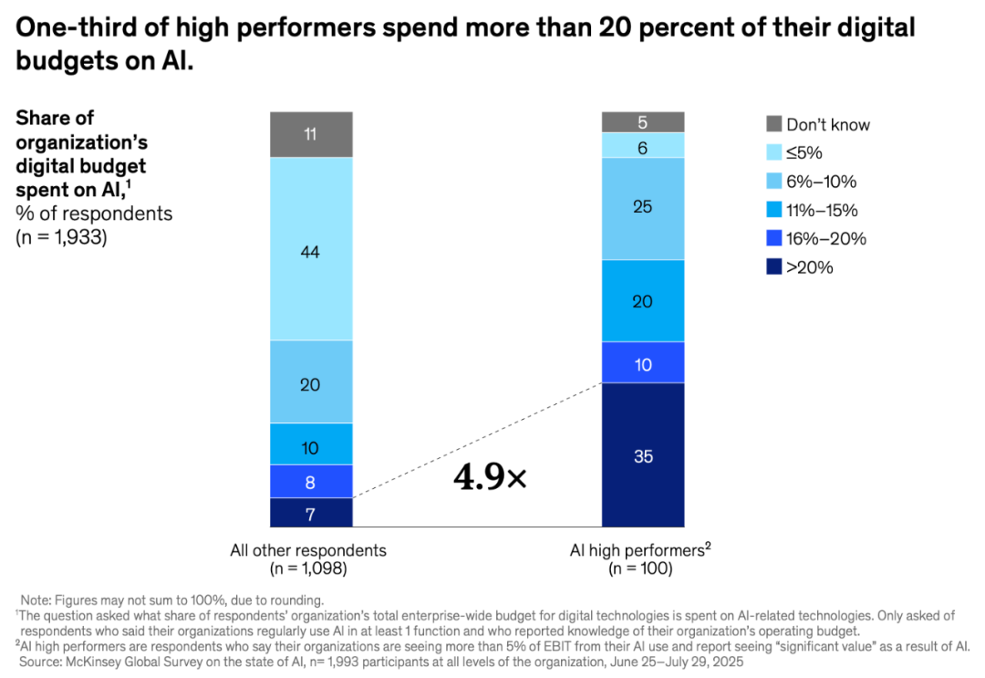 麦肯锡《State of AI 2025》数据:从AI应用里取得成效越高的企业越愿意大力投资AI,4.9x的差距。