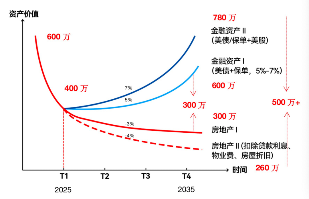 举个例子:2021年价值600万的房子,到2025年累计下跌30%多,只剩下400万。如果继续持有房地产,每年按3%速度下跌,10年后只剩下300万;如果加上利息、物业费、折旧等,每年按4%速度下跌,10年后只剩下260万。