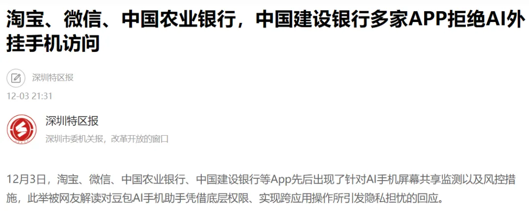 从目前的舆情看,社交媒体上对此争议最大的还是所谓的“隐私墙”问题,截至目前为止,据网友反映,微信、淘宝、支付宝、高德地图、农行、建行等APP都对豆包手机助手采取了“安全风控措施”。