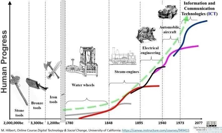 弗雷将人类技术文明史分为大停滞——前工业革命时代、大分流——英国工业革命、大平衡——美国工业革命、大逆转——计算机时代、未来——包括人工智能时代。即便在“大停滞”时代,也充满了创造性和智慧(如蒸汽轮机的发明等)。