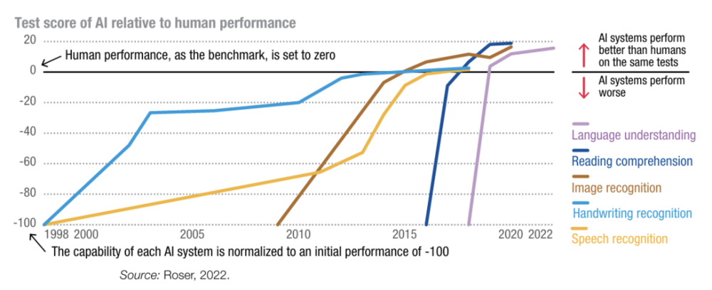 据联合国贸易和发展会议(UNCTAD)发布的《2025年技术与创新报告》,在同样的测试中,AI在语言理解、阅读理解和图像识别方面的表现已优于人类,在手写识别、语音识别方面的表现与人类基本持平(来源:unctad.org)