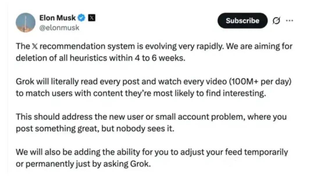 11月,马斯克宣布X用AI模型替代了大量员工,负责平台安全的工程团队裁员90%。图源:社交媒体