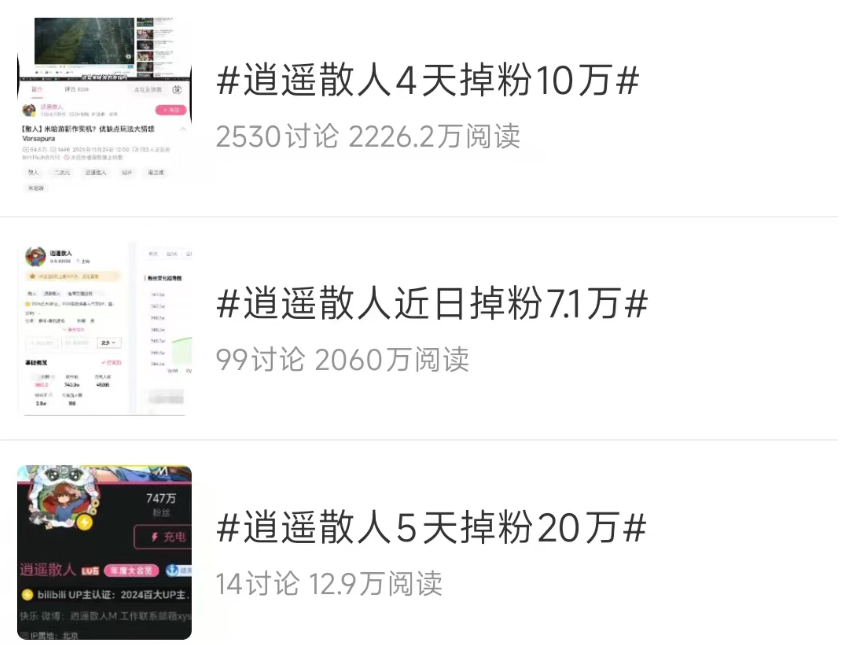 5天掉粉20万,最终掉了45万活粉。其中包括大批高等级舰长、逍遥散人与《逆水寒》《星绘有晴天》的合作被叫停、曾与他有过合作的品牌也被牵扯其中,客服团队大量被质问是否停止与他的合作,其中有些不明就里的客服回复,又形成一轮新的抵制传播路径。