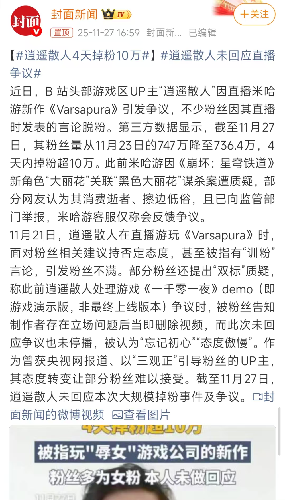 如果对圈子生态并不了解,看到逍遥散人又是掉粉又是掉商单,或许你会好奇他究竟做了什么。但实际上,导火索是那条与《Varsapura》有关的视频,以及粉丝劝说逍遥散人删掉视频时,他那句“现在什么国产游戏都有争议,玩家如果想玩的话玩就可以,如果因为争议强行不玩的话,吃亏的是自己。”