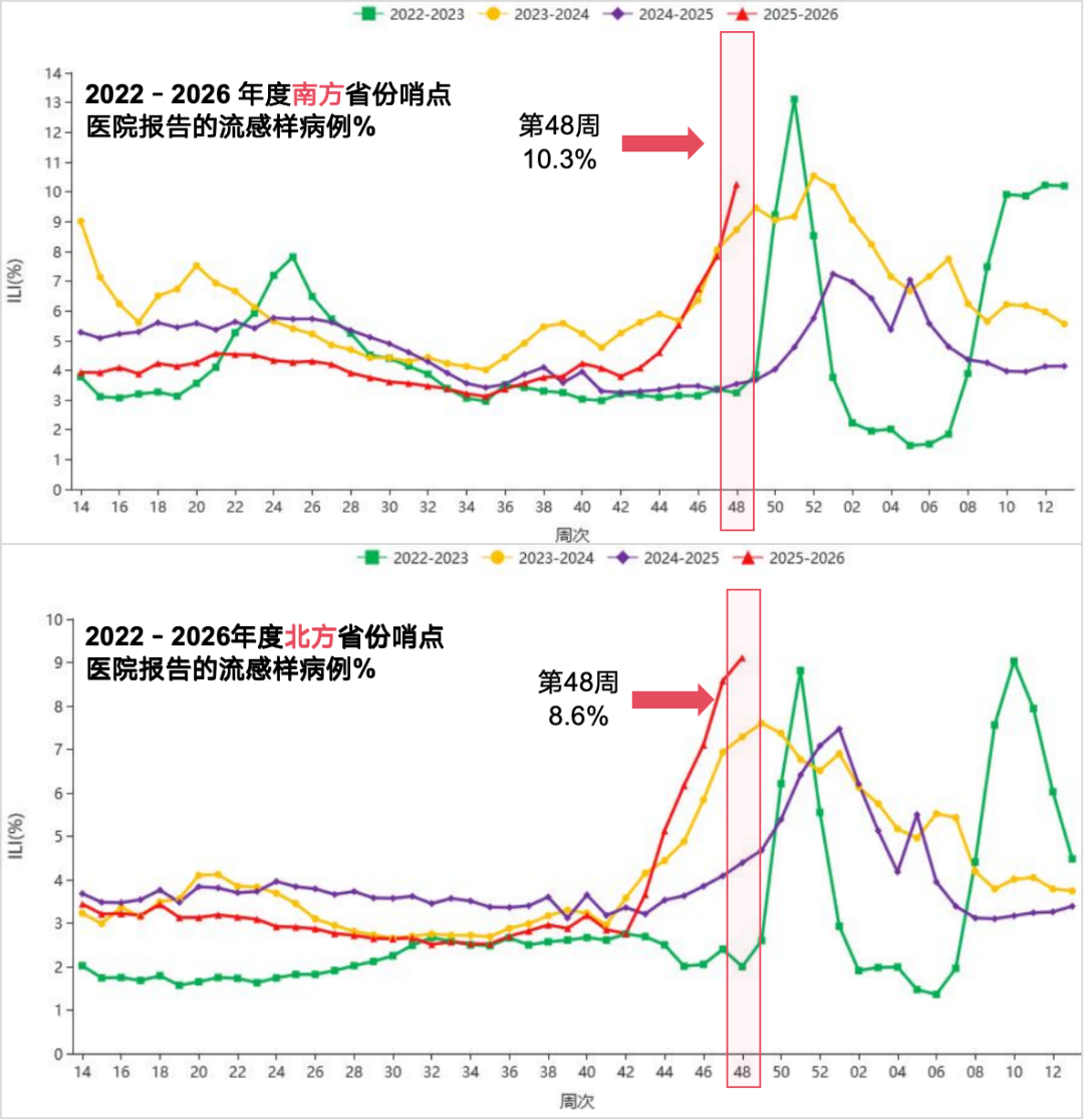 周报提到:2025年第48周,南、北方省份流感活动上升。
