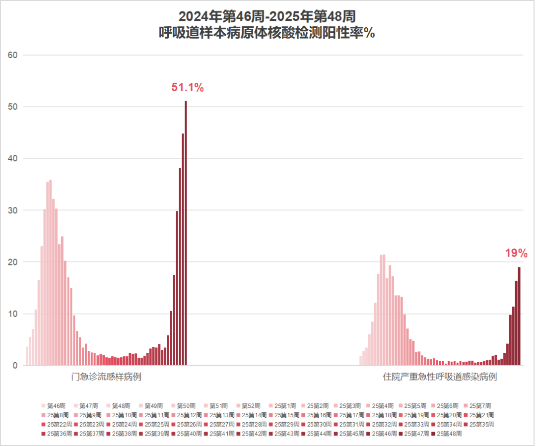 2025年第48周,门急诊流感样病例中近半(51.1%)呼吸道样本中能够检测到流感病毒,而2024年第48周的数据仅为7%。