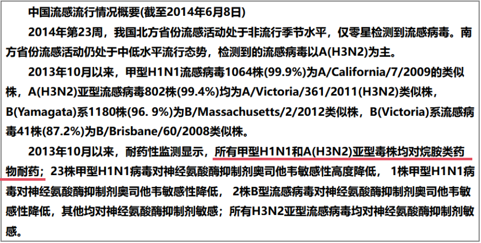 而中国国家流感中心能查到最早(2014年第23周)的报告就已经明确说:所有甲型H1N1和H3N2亚型流感毒株均对烷胺类药物耐药。