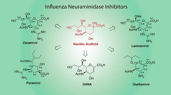 神经氨酸酶抑制剂结构,红色为N-乙酰神经氨酸的骨架结构|DOI: 10.3390/molecules21111513