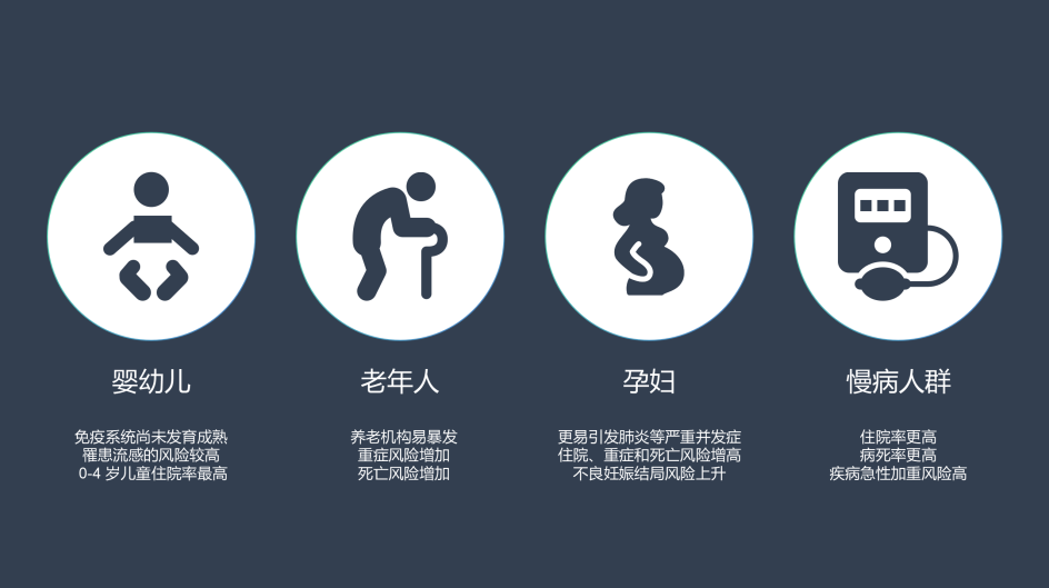 尤其推荐感染流感后易发生重症的人群接种疫苗,这些人群包括:老年人、<5 岁儿童、慢病患者、孕妇以及免疫功能低下等人群。