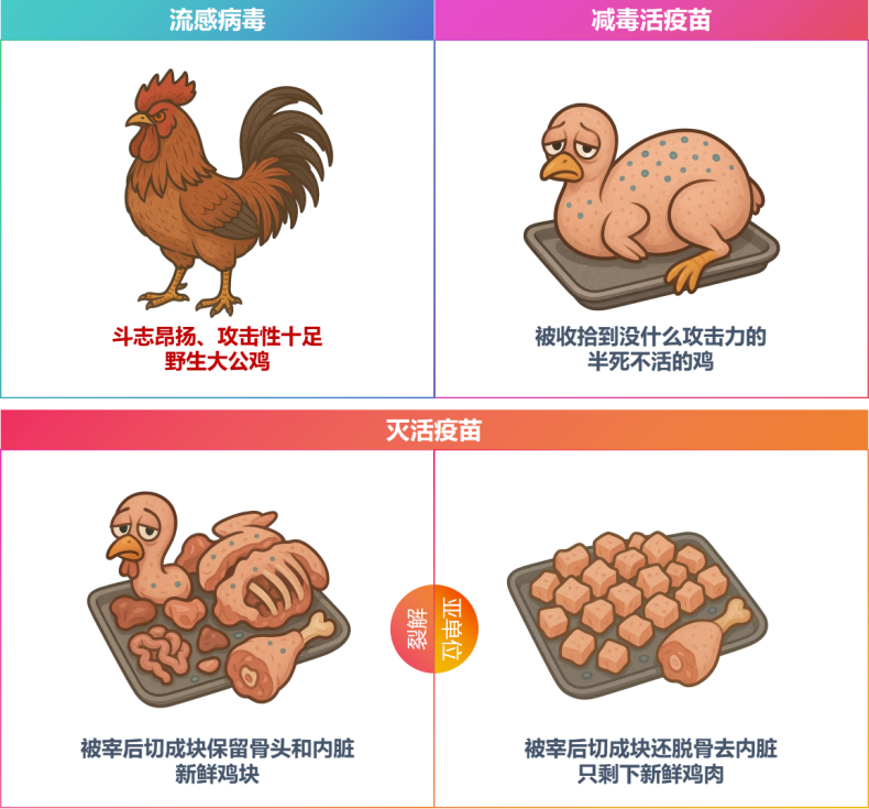 简单来说,如果流感病毒是一只斗志昂扬、战斗力十足的大公鸡,那么国内的这几种流感疫苗抗原可以用下列的方式理解: