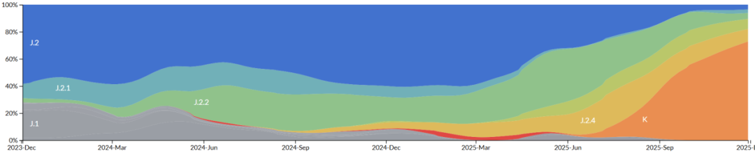 今年疫苗还有效吗?这个问题我们可以参考英格兰今年的情况,当地2025年第10周到第43周,K亚分支占比已超过85%。
