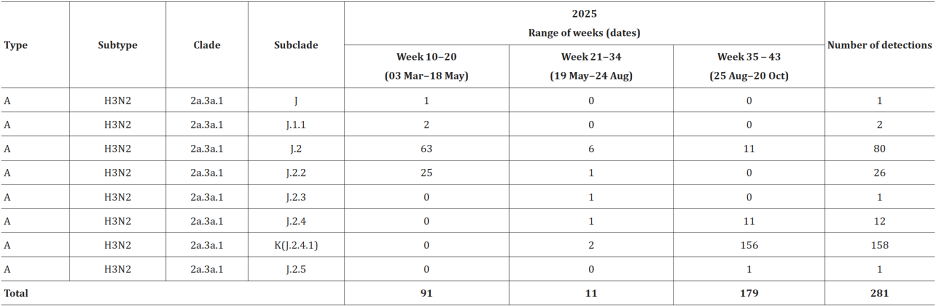 2025年第10周至第43周英格兰流感基因分支情况|参考资料3