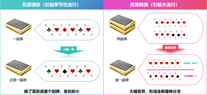 流感病毒的抗原漂移&抗原转换,扑克牌代表基因序列|作者自制