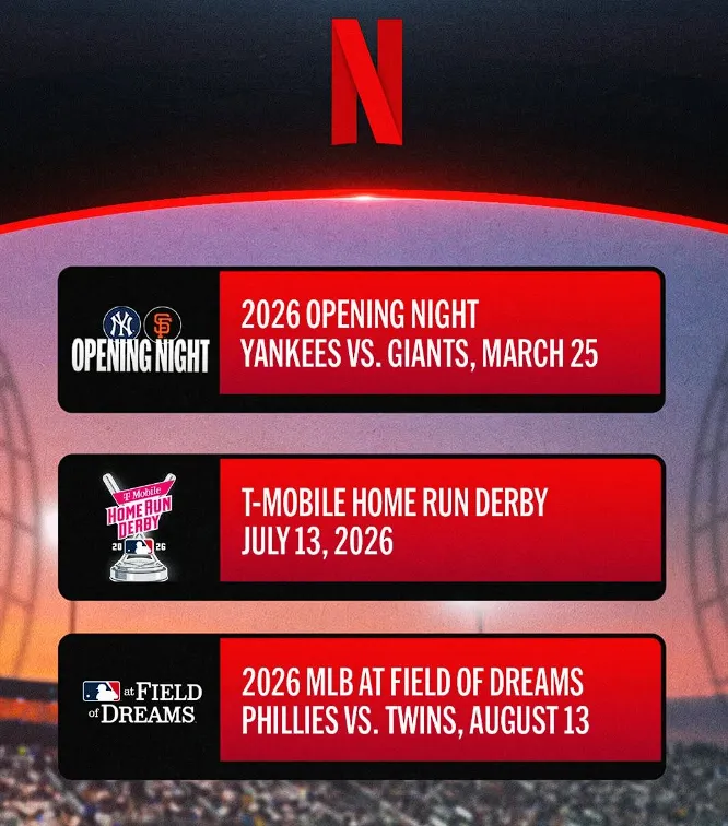 第二类是以Netflix(网飞)为代表的“事件化”模式。网飞不需要大量的赛事内容来填充内容库或者维持用户习惯,而是需要“大片”,因此他们就买下了NFL的圣诞大战,2026年还会播MLB新赛季的揭幕战(一场)、“逐梦之日”比赛(一场)和本垒打大赛,颇有一种平时你爱去哪看去哪看,但到了这种大日子你必须得来我这儿的感觉。对网飞来说,内容即营销。