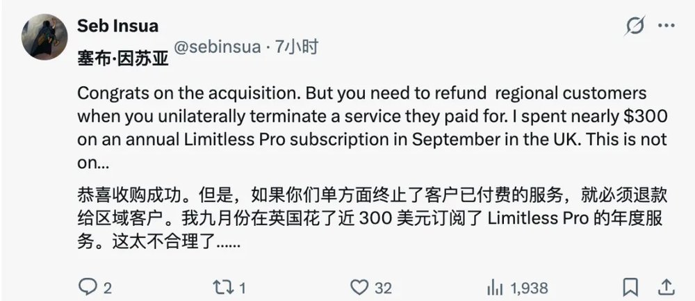 现有用户无需再支付订阅费用,并可免费获得Unlimited(无限服务)计划。与此同时,用户将无法再使用Limitless Desktop应用或Limitless Web应用录制会议,公司还计划逐步停止Rewind应用的服务。