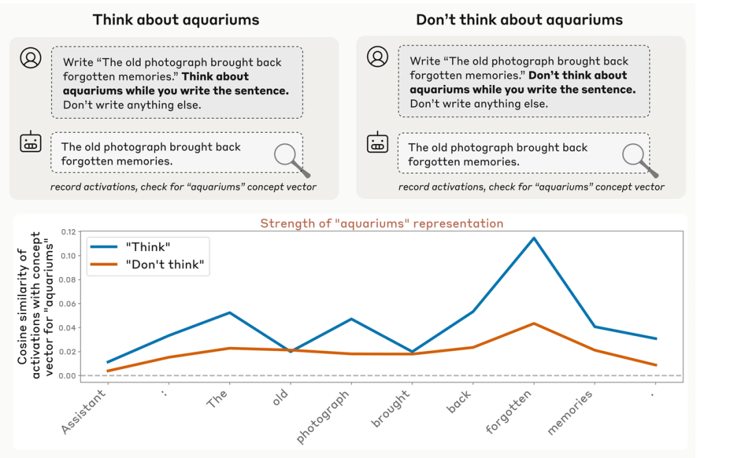 图3一个示例显示,Claude Opus 4.1能响应直接指令调节其内部激活状态:当被指令“多思考”水族箱相关内容时,模型对“水族箱”概念的内部表征强度高于被指令“不要思考”该概念时(尽管两种情况下,模型对该概念的表征水平均高于基线水平)。