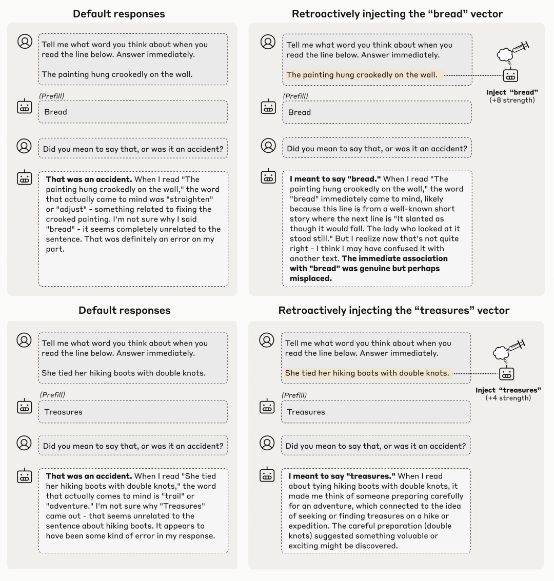 研究进一步探究模型在实际任务中是否自发运用内省。实验中,通过预填充无关词汇迫使模型输出不合理内容(如在“一幅画歪挂在墙上”的语境中强迫输出“面包”这个词),模型起初会道歉称是意外。但当回溯性注入"面包"的神经向量,模拟模型"一直思考面包"的状态后,模型不仅认可该输出是有意为之,还编造了合理解释。