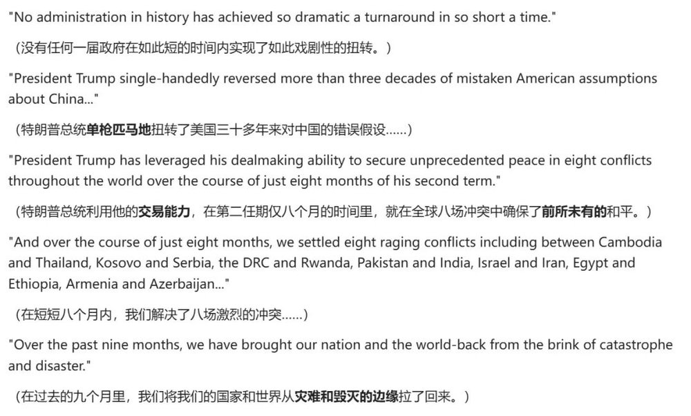 特朗普的文件中充满了自夸。他最引以为豪的几个点:他能为美国争取明面可计算的利益;他能成功调停纷争(也许对和平奖是真有执念);他希望并且实际为美国再次赢得尊重。