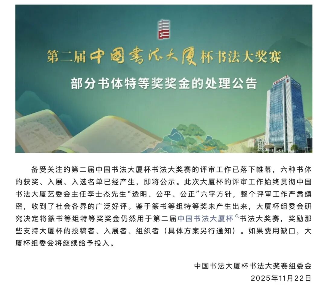 结果公布后,关于“字丑”“评委是老师”的质疑引发多方关注,11月22日,大奖组委会宣布取消该作品草书特等奖拟获奖资格,承认存在“个别领导做手脚“的事实。