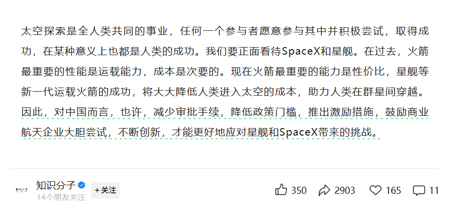 一些吹捧膜拜SpaceX的人,并没有把马斯克在火箭领域的成功当成一个工程学上的事件,而是当做一种神迹。他们实际上并不理解SpaceX是为什么成功的,所以也自然理解不了如今中国航天的发展路径。
