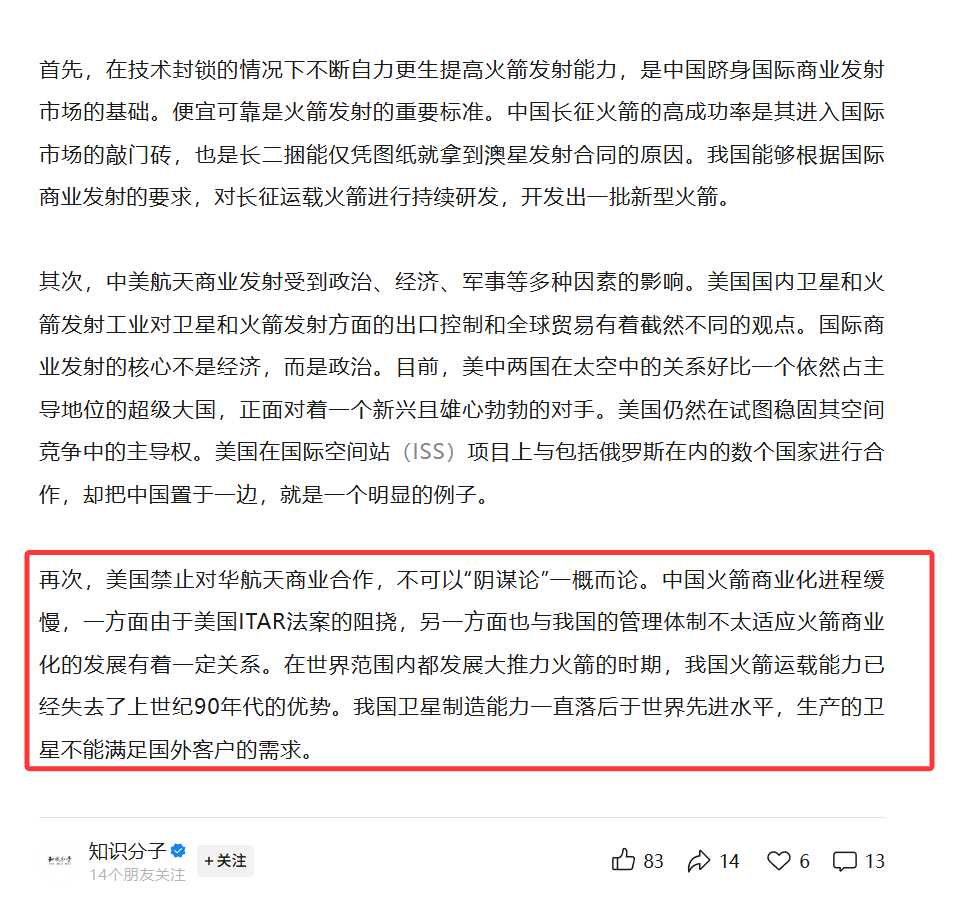 这同样能解释中国航天市场的发展。笔者在以前文中提到过,在中国的航天爱好者圈子里有一个非常有趣的现象,一部分立场比较左翼的航天爱好者,在其他问题上可能会强烈反对市场化,但是在商业航天问题上却相信市场化万能。这种想法可以说是并不理解市场经济本身了。