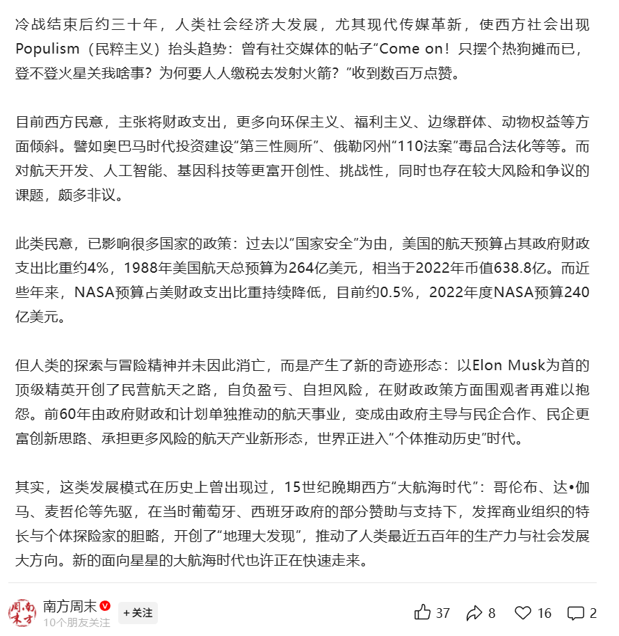 显然,中国航天的进步之路和美国是不太一样的。背后根本的原因是中国市场和美国市场的差异性。对于这一根本性差异,舆论往往认识的不是很充分。不过笔者倒是可以理解,毕竟航天产业本身的特点,把宏大和渺小放大到了极致,所以人很容易在这种情况下感觉到崇高感。这也是为什么航天问题下面,很容易聚集一批喜欢宏大叙事的人的原因。而一旦开始谈市场,谈钱,谈利润率,这种东西就很难有崇高感了。
