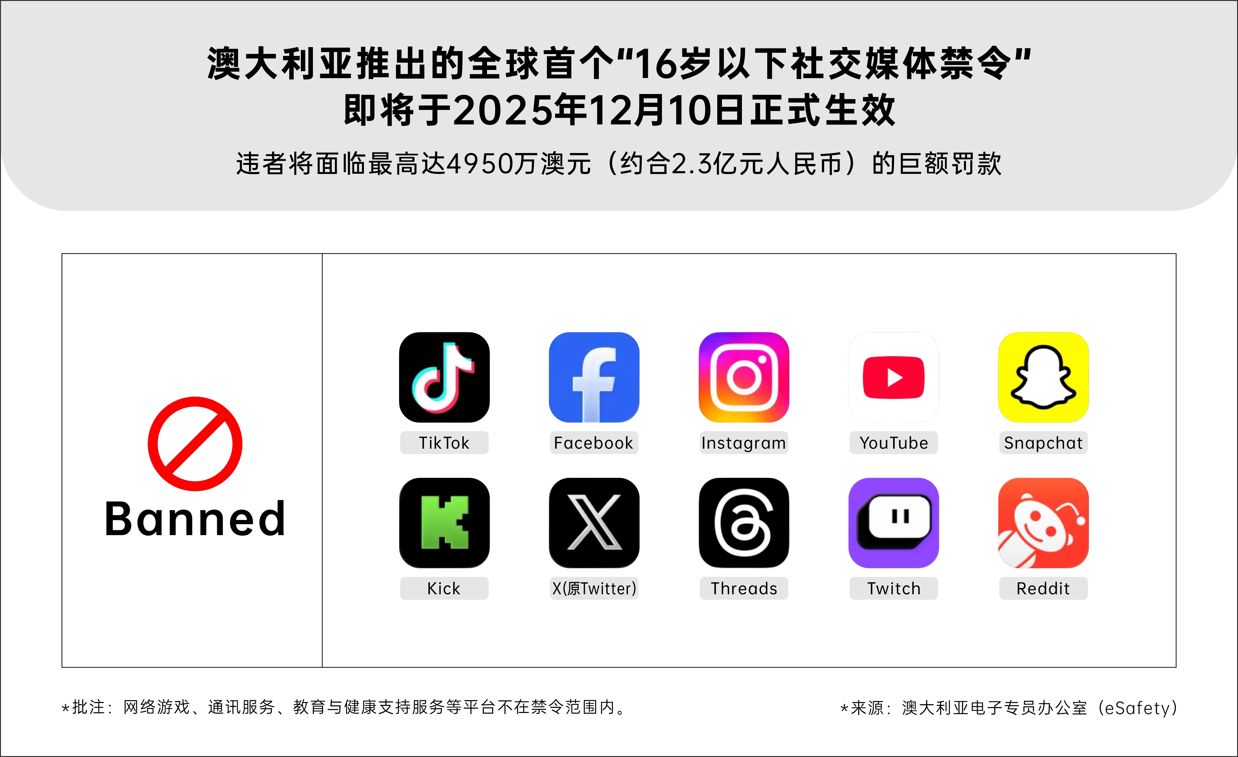 在世界范围内,有些国家已经走出了讨论范畴,以法律的形式对社媒展开限制。今年12月10日起,Facebook等社交平台就要应澳大利亚政府要求,避免16岁以下用户创建账户并停用现有的违规账户,或面临最高4950万澳元(约2.3亿人民币)罚款。澳大利亚对社媒的定义采用了如下标准——一项服务是否能够促成两个或多个用户之间的在线社交互动。但特意除外了通讯应用,网络游戏,以及健康和教育相关的应用。
