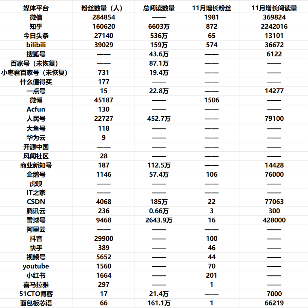 截止目前,微信公众号是28.4万。知乎是16万。其它各个平台也有一些,数据我都可以公开,如下: