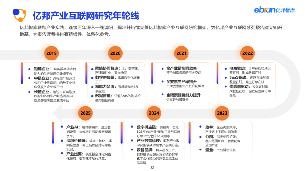 亿邦动力自2019年起,每年发布产业互联网研究报告,在各位朋友的支持下,我们七年来持续刻画产业互联网的年轮线。我们坚信,产业互联网必将如年轮般一圈圈生长,终成参天大树。产业互联网一定还有新故事,也必将是“千峰竞秀”,它只是比消费互联网晚了十年而已。