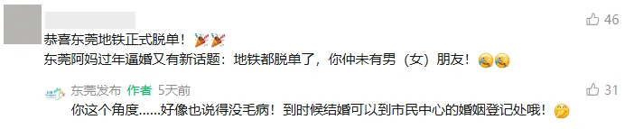 “(东莞)地铁都脱单了,你仲未有男(女)朋友!”(图/东莞发布微信公众号截图)