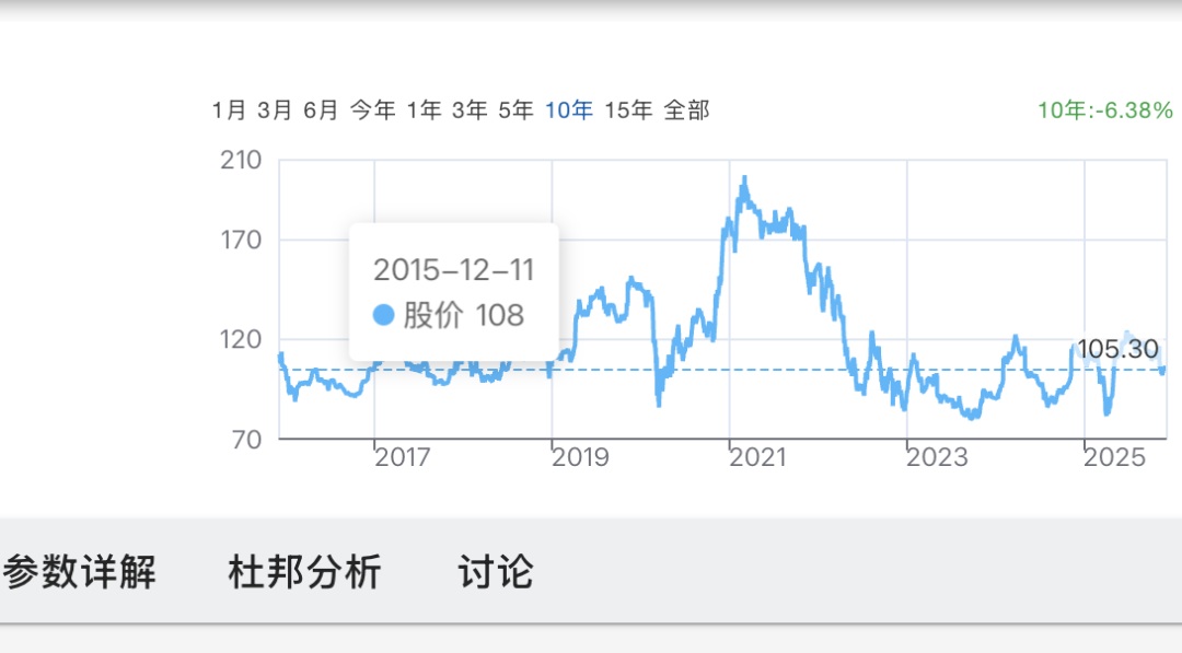 迪士尼的投资者最近 10 年都应该是很不满意的,股价在 10 年时间里,甚至是-6%(如下图),而由于迪士尼一直在融资收购,利息费用也高昂,分红的比例收益也很低。