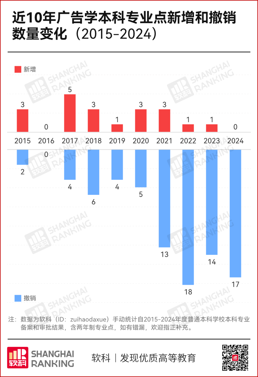 时宜事易,移动互联网的进入打破了延续数十年的广告业模式。有人说广告的上一个风口是上世纪,也有人追问广告的下一个风口在哪?作为行业人才培养的缩影,近10年来(2015~2024),广告学成为文学门类中撤销专业点数量最多的专业,似乎在间接印证“广告业没落”的论断。