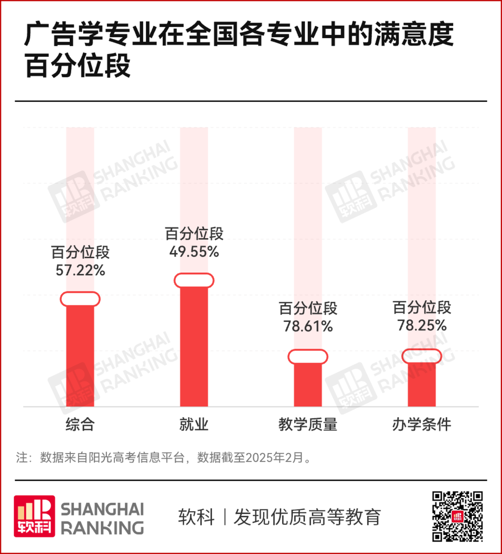 根据阳光高考信息平台对全国本科高校学生专业满意度的调查(数据截至2025年2月),在561个有得分的本科专业(类)中,广告学以4.031分的综合满意度排在第321位(百分位段57.22%),就业满意度排在前50%的同时,教学质量和办学条件的满意度却都在“吊车尾”。
