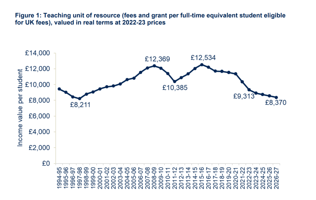 ■数据显示,每位学生对英国高校的经济贡献,随着时间的推移愈发减少,近几年甚至退回到了90年代(以学费在教学资源上的体现为衡量标准)