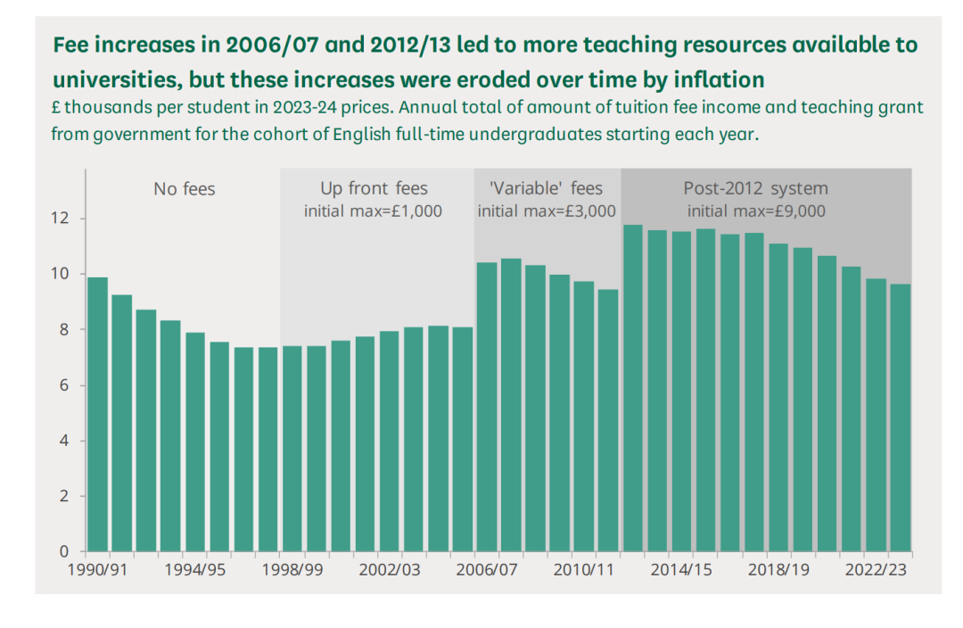 而这8年通胀飙升,大学运营成本水涨船高。到2024年,按通胀调整,学费早该涨到1.2万英镑以上。