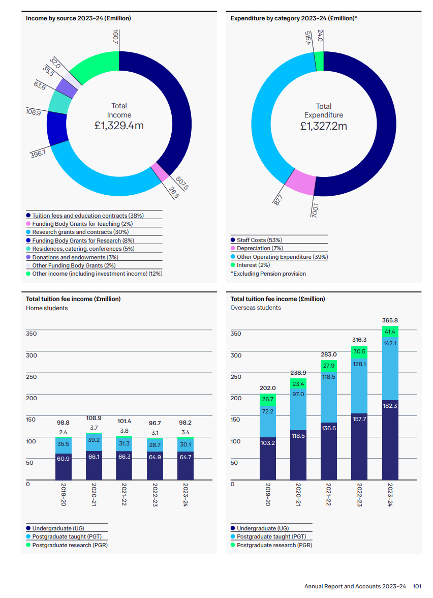 数据显示:2022/23学年,英国高等教育机构总收入约500亿英镑,52%来自学费,这52%里43%是国际学生交的。
