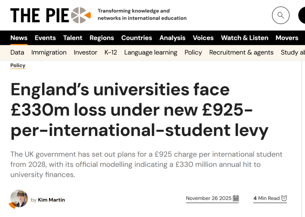 11月26日,英国政府发布官方公告公开征询技术建议,“留学生税”正式提上议程:自2028年8月1日起,计划每年向每位国际学生收取925英镑固定费用,用以支持弱势学生的专项生活补助。