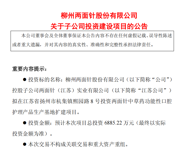 在扬州杭集镇,两面针正在筹划建设中草药功能性口腔护理产品生产基地扩建项目。该公司计划投资6885.22 万元,建设一个牙膏生产车间和酒店用拖鞋生产车间。