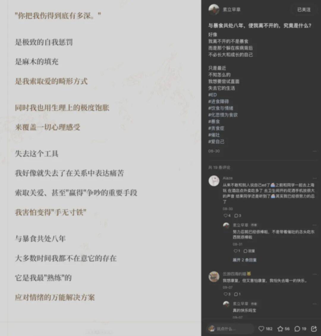章章:我之前刷小红书的时候,发现甚至有一个厌食症患者群体,他们会在小红书上分享自己的生活,评论区有很多的小女孩很崇拜他们。我甚至有看到过“求推荐厌食症患者的小红书”的这类的帖子,然后下面就有好多人评论,说 ta 喜欢看这个,ta 喜欢看那个……