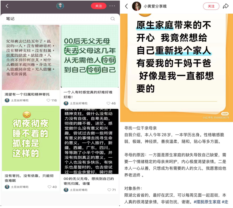 其实我们在小红书这样的社交平台中经常会刷到:“90后女生求本地干妈,可养老送终”“58岁独居阿姨招干女儿,提供住房与陪伴”等诸如此类的“认干亲”帖子。