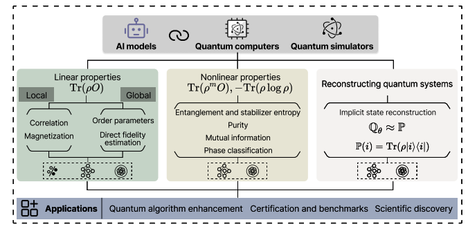 图1:利用人工智能表征和刻画量子系统的关键任务与应用概览。对由量子模拟器生成的基态以及数字量子计算机制备的量子态进行表示与特性刻画,可归纳为三类主要任务:线性性质预测、非线性性质预测以及量子态与量子过程的重建。每一类任务又可进一步细分为不同子类,以对应更具体的研究目标。底部的图标表示通常用于各类任务的AI学习范式——机器学习(ML)、深度学习(DL)和语言模型(LM)。这些方法当前及潜在的应用场景包括:量子算法优化、量子器件的认证与基准测试、量子硬件开发,以及科学发现。