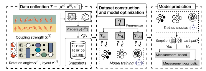 图3: 量子系统学习协议的整体框架。 目前用于表示和刻画可扩展量子系统的学习模型一般包含三个阶段: 数据收集、模型构建与优化、模型预测 。左侧面板展示了数据收集阶段,其中量子系统在参数x (i) 和辅助信息z (i) 的控制下被制备为量子态ρ(x (i) )。随后,对该量子态进行T次测量以获得测量结果s (i) 。中间面板展示了数据集构建与模型实现阶段。当原始数据集T收集完毕后,需要根据具体任务对其进行预处理,生成对应的任务数据集T ML 、T DL 和T LM ,分别用于训练基于ML、DL和LM的模型。右侧面板展示模型预测阶段。根据预测是否需要额外的量子测量数据作为输入,学习协议可分为基于测量的学习(measurement-based)和独立于测量的学习(measurement-agnostic)两类。